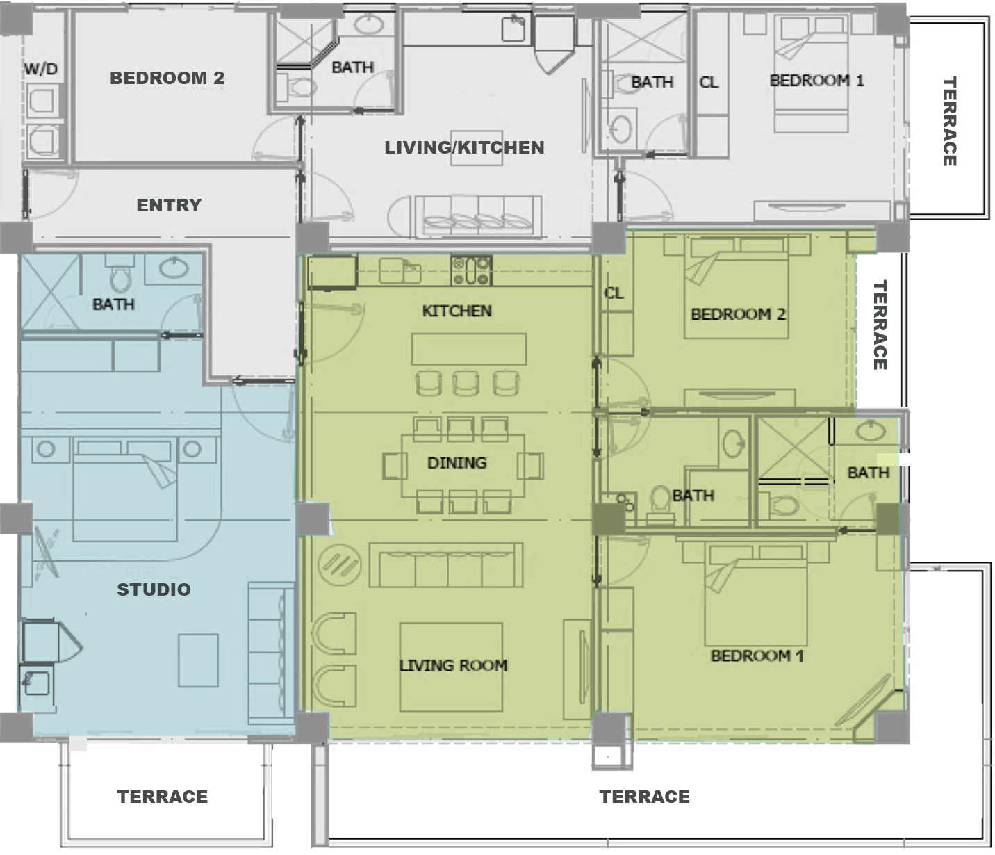 The 3 BR Combo includes a full kitchen with the full-size appliances and essential cookware for comfortable dining at home. The Studio also as a kitchenette. The living and dining areas open directly onto the two ocean-view terraces, creating seamless indoor-outdoor living.